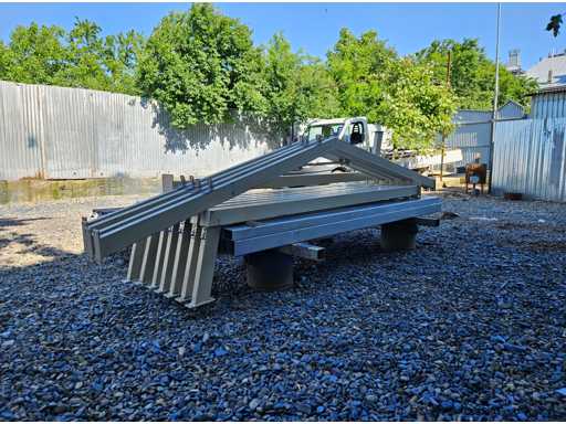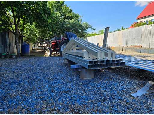 dodatkowe konstrukcje metalowe; Konstrukcja składa się z: 4 kratownic wykonanych z rur prostokątnych o wymiarach 100x50x3; 8 filarów wykonanych z rur kwadratowych o wymiarach 100x100x3; 2 filary nośne z profilu C 100 oraz poprzeczka drzwiowa z profilu C 100 i poprzeczka drzwiowa z profilu C 100, łączące kliny na kratownice z ocynkowanego profilu C 100; Konstrukcja jest zdejmowalna, na śrubach; Stan zdrowia: nieużywany; Budowa obejmuje certyfikat zgodności, rysunek konstrukcyjny; Darmozjad. nie obejmuje blachy. Darmozjad.