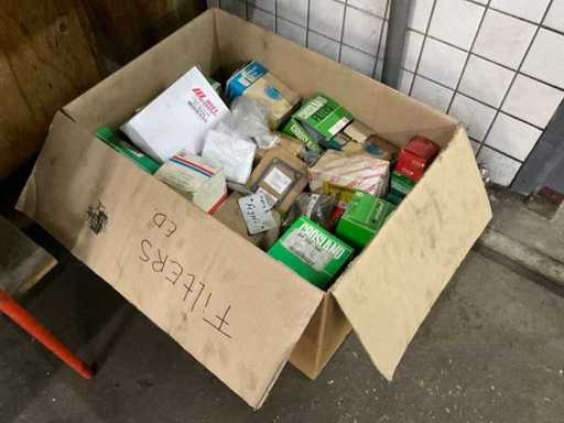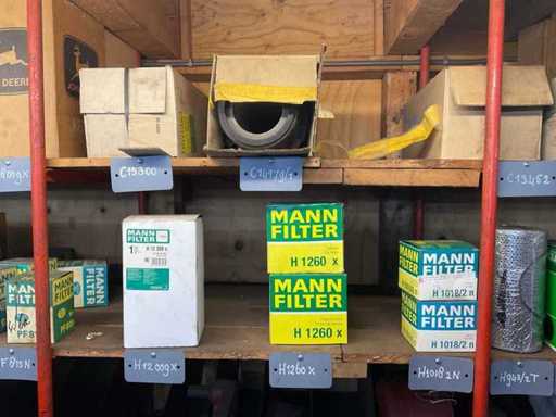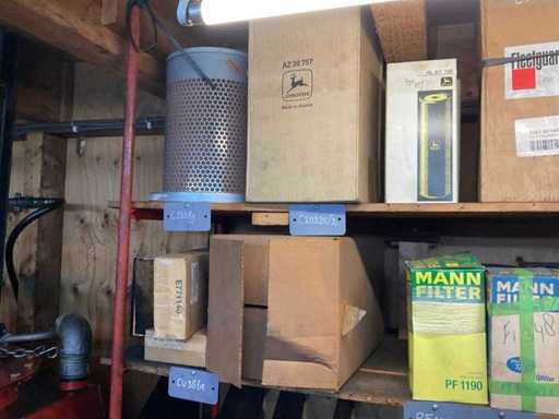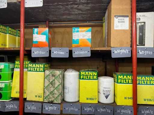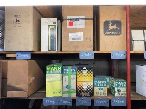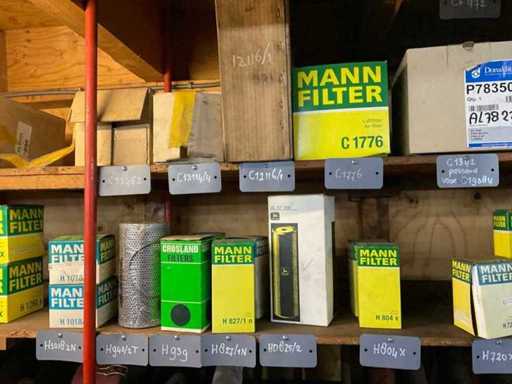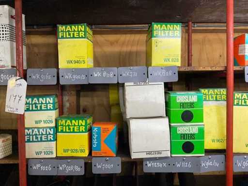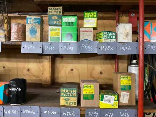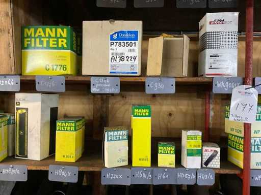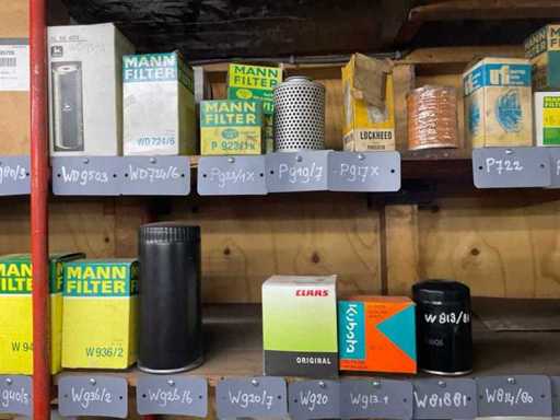 Różne filtry powietrza na 2 półkach, różne marki, modele, typy i rozmiary.