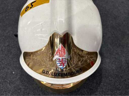 Helmet in traditional French firefighter style with pronounced helmet comb, gold-coloured visor and heat protection collar made of silver-coated fabric. Visible coat of arms embossing "Sapeurs Pompiers – G.D. Luxembourg" with fire flame and national coat of arms.