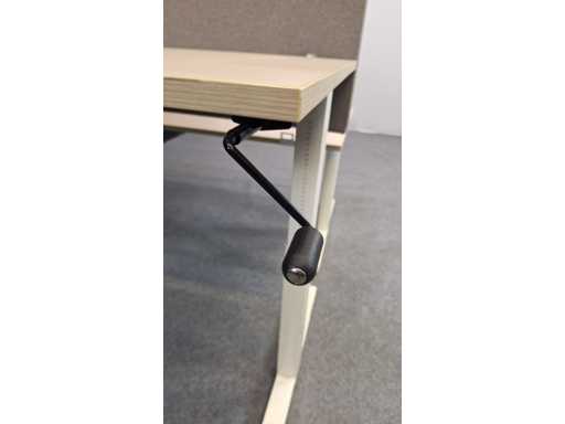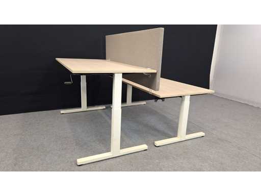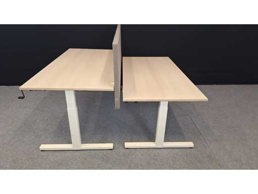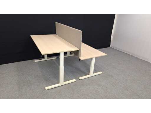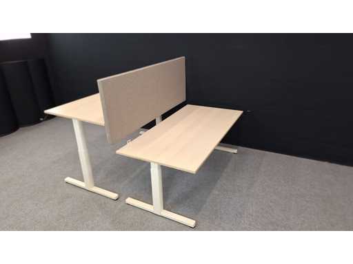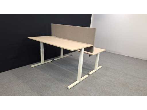 Podwójny warsztat składający się z dwóch biurek regulowanych wysokością (620 - 900 mm), podstawa w kolorze metalu białym, blaty w kolorze melaminowym w jasnym dębie, ściana akustyczna pokryta tkaniną w kolorze beżowo-szarym, w dobrym stanie