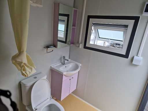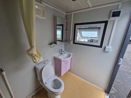 Dostarczać; toaleta, prysznic, zasłona prysznicowa, zlew, szafka do przechowywania, oświetlenie, szczotka do toalety, wentylator, okno uchylne, podnoszenie oczu, szafka z lustrem, zamykana na klucz, nieużywana