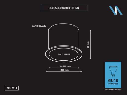 sealing IP20, product color sand gold black, dim. Ø 68 x 50mm, installation diameter ø 60mm, material aluminum, fitting GU10, including ceramic lamp holder, bulb light source not included, suitable for indoors, one bulb input, voltage 220-240V, SKU 00913 SKU353