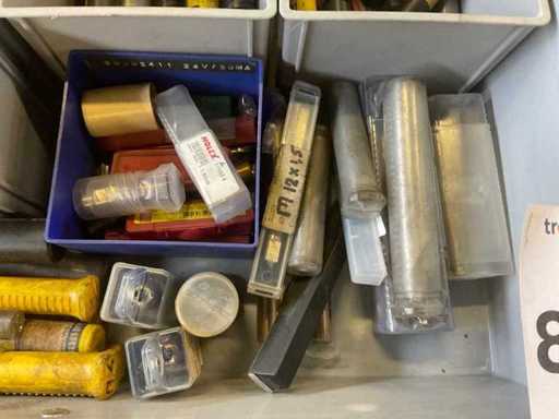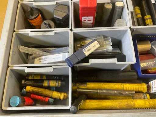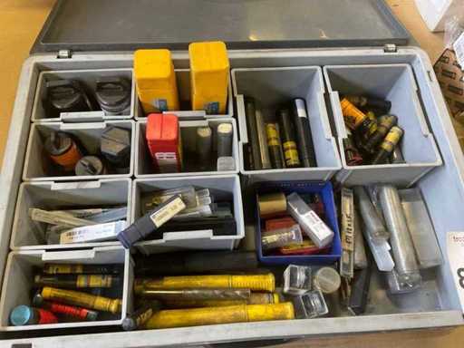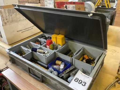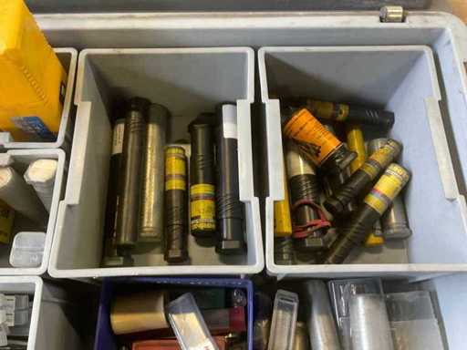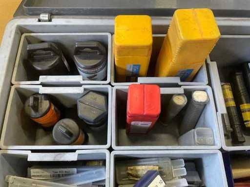 Plastikowa skrzynka z pokrywą z pojemnikami do sortowania zawartości, różne wiertarki
