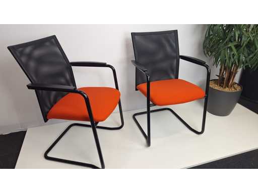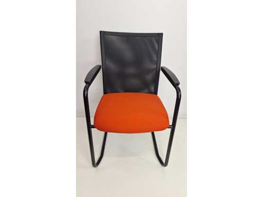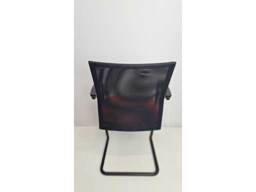 Sled base in metal color Black, seat upholstery in fabric color Red, backrest in netweave color Black, armrests in plastic color Black, good condition