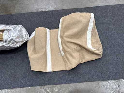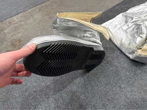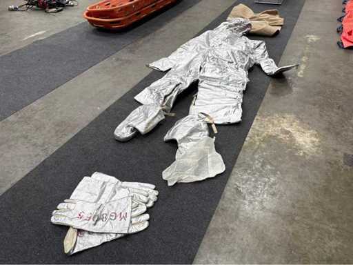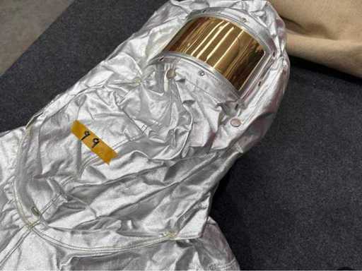 Complete aluminized heat protection suit with reflective surface to protect against extreme radiant heat. Incl. matching PPE components: gloves, boots with heat protection sole, gold-coated helmet visor and transport cover. New and unworn, suitable for hot work areas.