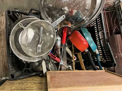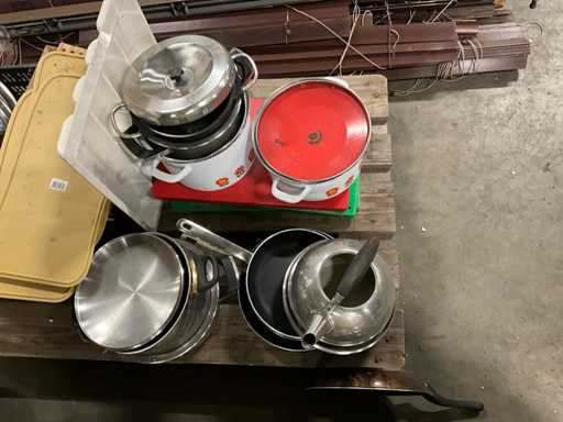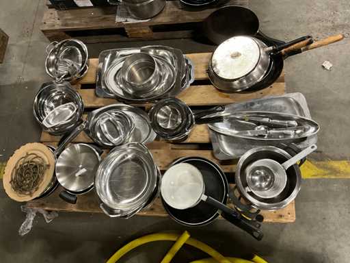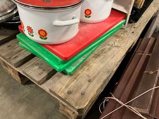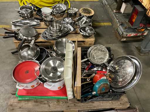 W tym patelnie, naczynia do serwowania, deski do krojenia i różne rzeczy na dwóch paletach