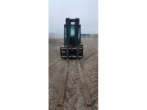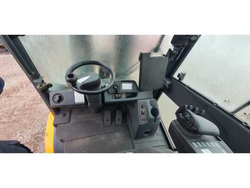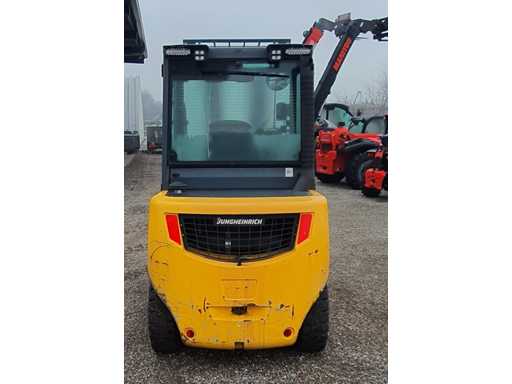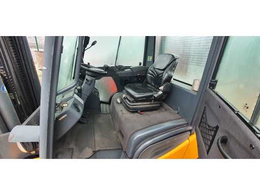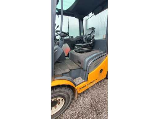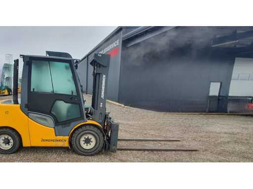 Jungheinrich diesel wózek widłowy, DFG S50, trójskokowy pełny wolny skok, 4 zawory, boczna zmiana + regulacja zębów, przednie opony 95% Sit 300-15, tylne opony 95% Sit 28,9-15, prześwit kierownicy, łatwa obsługa łożysk, widelce lekko zgięte w dół