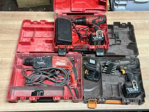 Składa się z elektrycznej wiertarki młotkowej oraz dwóch bezprzewodowych wiertarek.