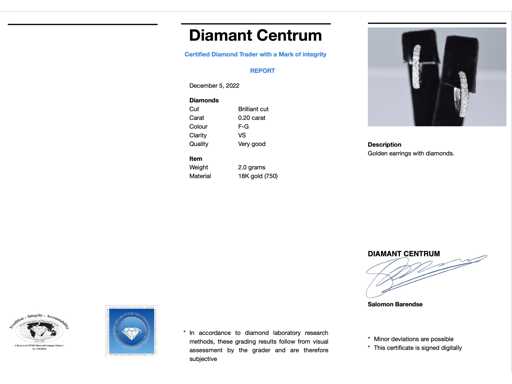 Diament: naturalne; Cięcie: Brilliant cut; Waga (karat): 0,20 karata; Kolor: F-G; Czystość: USA; Jakość cięcia: Bardzo ładna; Klejnot: kolczyki; Waga: 2 gramy; Wymiary/długość: 13 mm; Materiał: 18K gold (750); Stan zdrowia: Nowy; Pakowanie: Luksusowa szkatułka na biżuterię; Wyjaśnienie: Jakość została zaczerpnięta z raportu dotyczącego przedmiotu. Wycena to ocena certyfikowanego dealera diamentów, oparta na cenach konsumpcjalnych; Cena konsumpcja: € 3 395