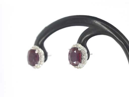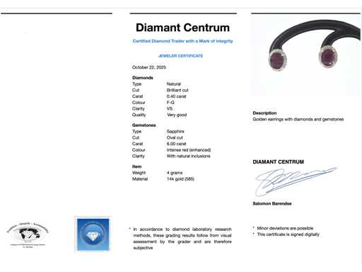 Diament: naturalne; Cięcie: Brilliant cut; Waga (karat): 0,40 karat; Kolor: F-G; Czystość: USA; Jakość cięcia: Bardzo ładna; Kamień szlachetny: rubin; Ilość: 2 elementy; Cięcie: Owalne; Waga (karat): 6,00 karat; Kolor: intensywny czerwony (wzmocniony); Czystość: z naturalnymi dodatkami (wzmocnionymi); Klejnot: kolczyki; Waga: 4 gramy; Materiał: 14 karatów (585); Stan zdrowia: Nowy; Pakowanie: Luksusowa szkatułka na biżuterię; Wyjaśnienie: Jakość została zaczerpnięta z raportu dotyczącego przedmiotu. Wycena to ocena certyfikowanego dealera diamentów, oparta na cenach konsumpcjalnych; Cena konsumpcja: € 3 520