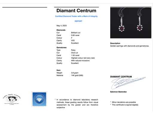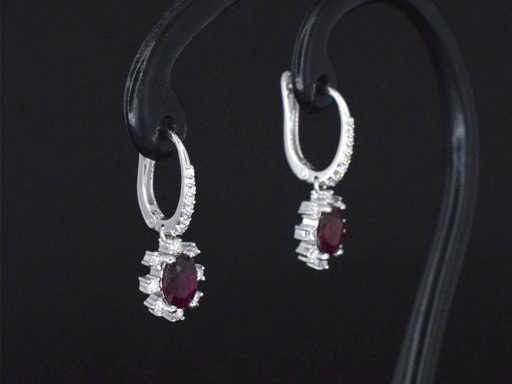 Diament: naturalne; Ilość: 32 sztuki; Cięcie: Brilliant cut; Waga (karat): 0,60 karata; Kolor: F; Czystość: VVS; Cięcie: Doskonałe; Kamień szlachetny: rubin; Cięcie: Owalne cięcie; Waga (karat): 1,50 karat; Kolor: Górny kolor czerwony (bardzo rzadki); Czystość: z naturalnymi inkluzjami; Klejnot: kolczyki; Waga: 3,9 uncji; Wymiary/długość: 26 mm; Materiał: 14-karatowe złoto (585); Stan zdrowia: Jakby nowy; Pakowanie: Luksusowa szkatułka na biżuterię; Wyjaśnienie: Jakość została zaczerpnięta z raportu dotyczącego przedmiotu. Wycena to ocena certyfikowanego dealera diamentów, oparta na cenach konsumpcjalnych; Cena konsumencka: € 9 800