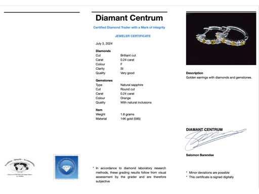Diament: naturalny; Ilość: 6 sztuk; Cięcie: Brilliant cut; Waga (karat): 0,24 karat; Kolor: F; Czystość: SI; Jakość cięcia: Bardzo ładna; Kamień szlachetny: szafir; Ilość: 6 sztuk; Cięcie: Cięcie okrągłe; Waga (karat): 0,24 karat; Kolor: pomarańczowy; Czystość: z naturalnymi inkluzjami; Klejnot: kolczyki; Waga: 1,8 uncji; Materiał: 14-karatowe złoto (585); Stan zdrowia: Jakby nowy; Pakowanie: Luksusowa szkatułka na biżuterię; Wyjaśnienie: Jakość została zaczerpnięta z raportu dotyczącego przedmiotu. Wycena to ocena certyfikowanego dealera diamentów, oparta na cenach konsumpcjalnych; Cena konsumpcyjna: € 1 925