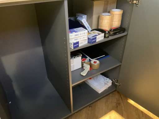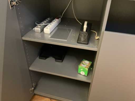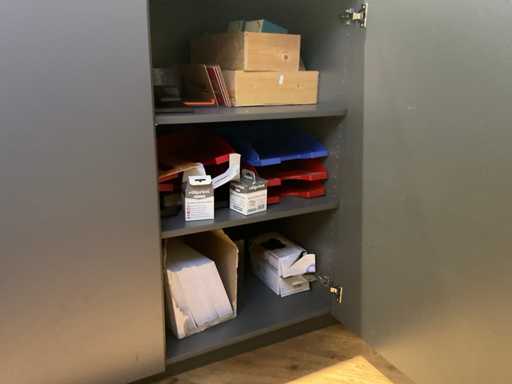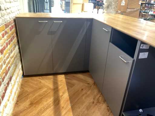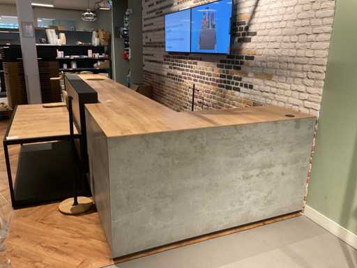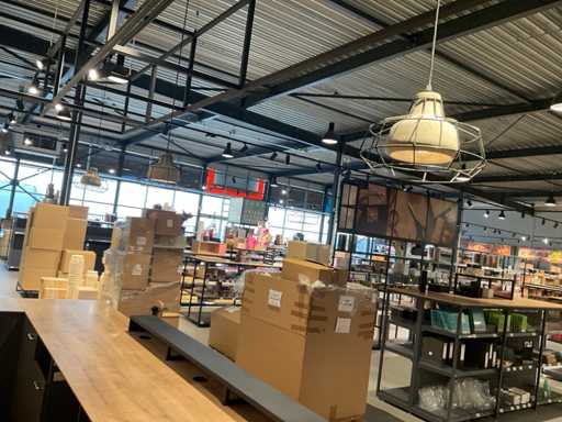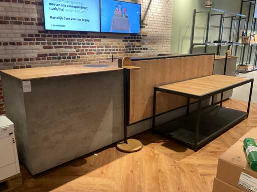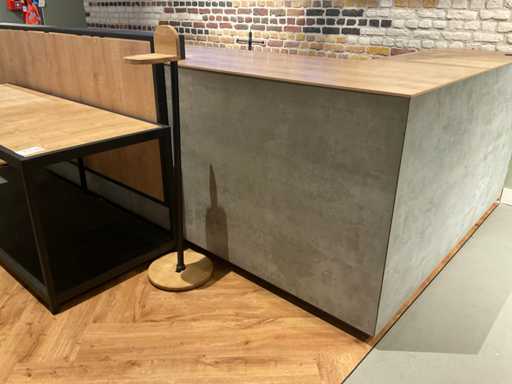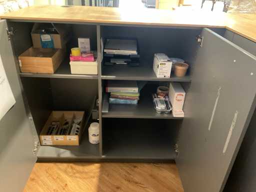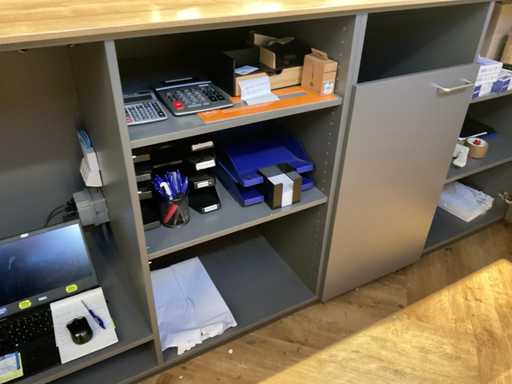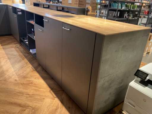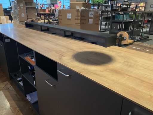 Wyposażony w różne przegródki, częściowo z drzwiczkami, w tym zawartość, w tym artykuły piśmiennicze, podniesioną część środkową, ok. 240 cm szerokości, ok. 120 cm wysokości, w tym 3 lampy wiszące.