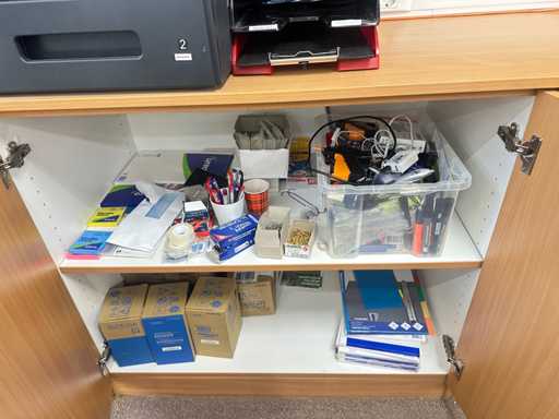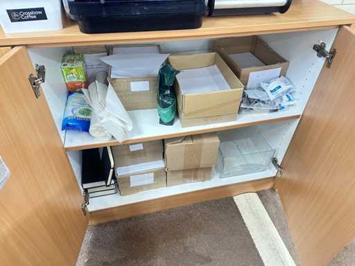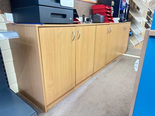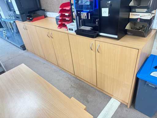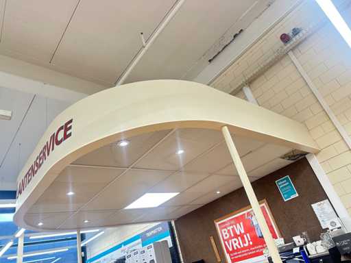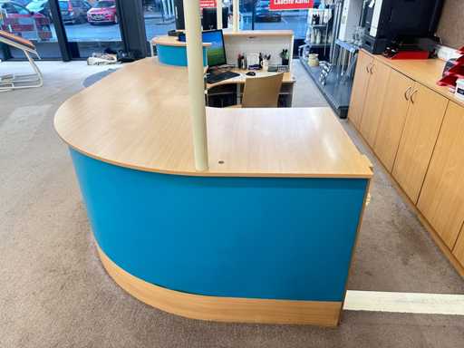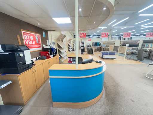Ten drewniany blat sklepowy z tylną ścianą sprzedawany jest z nadbudówką. Zawartość należy do tej partii, z wyjątkiem komputera, drukarki, ekspresu do kawy i maszyny do pinów. Wymiary tylnej ściany to 300x58x88 cm (WxDxH). Wymiary nadbudówki to 300x300x48 cm (WxDxH)