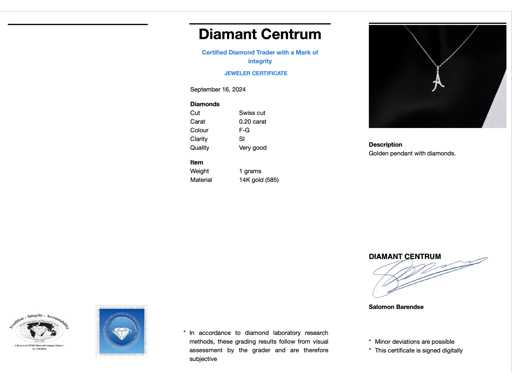 Diament: Naturalny; Cięcie: cięcie szwajcarskie; Waga (karat): 0,20 karata; Kolor: F-G; Czystość: SI; Jakość cięcia: Bardzo ładna; Klejnot: Wisiorek (z wyjątkiem naszyjnika); Waga: 1 gram; Materiał: 14-karatowe złoto (585); Stan zdrowia: Nowy; Pakowanie: Luksusowa szkatułka na biżuterię; Wyjaśnienie: Jakość została zaczerpnięta z raportu dotyczącego przedmiotu. Wycena to ocena certyfikowanego dealera diamentów, oparta na cenach konsumpcjalnych; Cena konsumencka: € 1 295