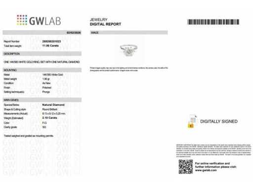 Luksusowy pierścionek Solitaire z diamentu naturalnego 2,10 karatu z białego złota 14k, całkowita waga 1,96 gr. Centralny kamień to naturalny diament z okrągłego brylantu, TOP w kolorze F-G/SI2 o masie 2,10 karatu. Certyfikowany przez GWLAB Laboratoire, jeden z największych międzynarodowych instytutów certyfikacji i oceny diamentów oraz kamieni szlachetnych. Więcej informacji w artykule zobacz certyfikat. Biżuteria w rzeczywistości jest lepsza niż zdjęcia. Szacunkowa cena sprzedawcy: 44'150.-