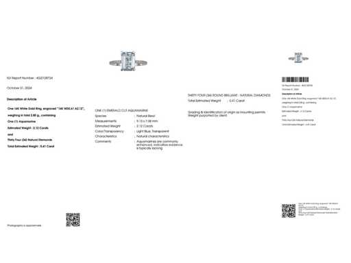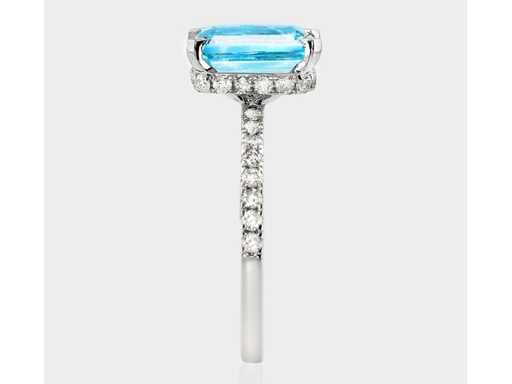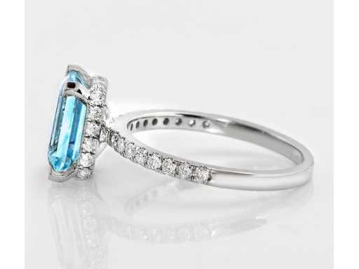 Luksusowy pierścionek Natural Blue Aquamarine 2,53 karatu z 14k białego złota, całkowita waga 2,80 gr, z szmaragdowym kształtem, naturalny niebieski akwamaryn o masie 2,12 karatu oraz 34 okrągłe diamenty naturalne o masie 0,41 karata. Certyfikowany przez IGI, jeden z największych niezależnych na świecie instytutów certyfikacji i wyceny kamieni szlachetnych. Więcej informacji w zaświadczeniu. Biżuteria w rzeczywistości jest lepsza niż zdjęcia. Szacunkowa cena detaliczna: € 6'750. - Nowa biżuteria.