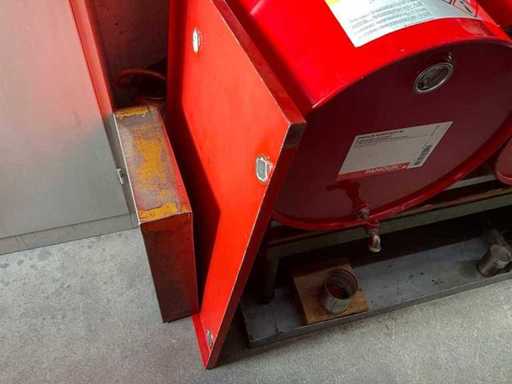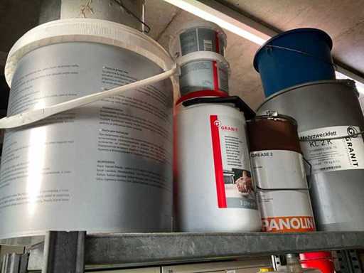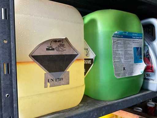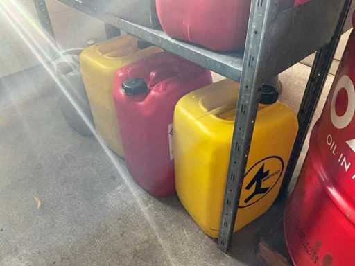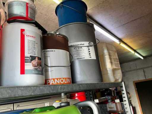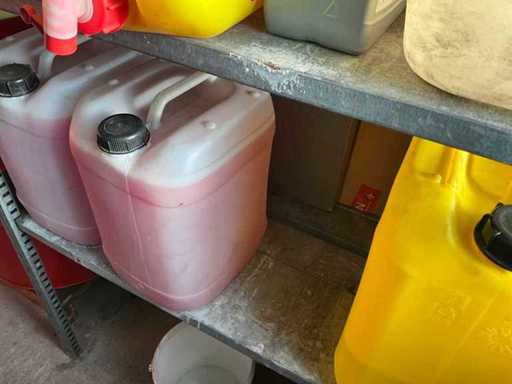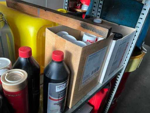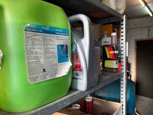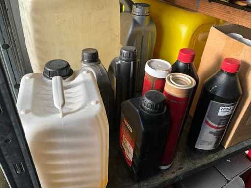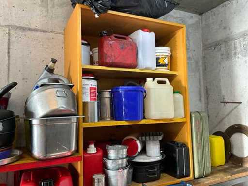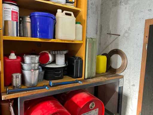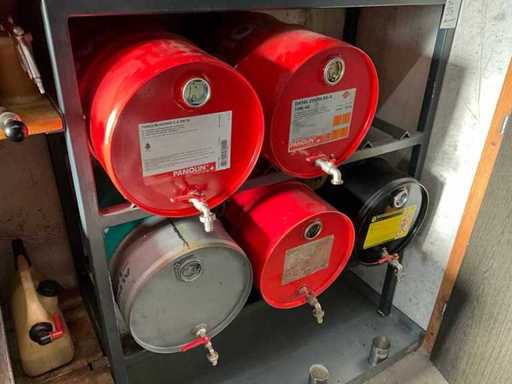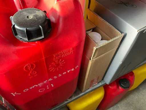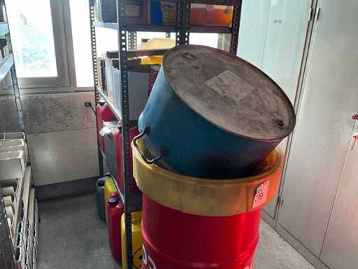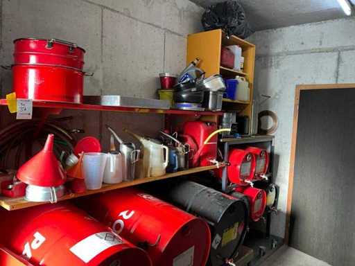 Według zdjęć, oszacowana waga, cały magazyn oleju z beczkami, pojemnikami i regałami z miskami na olej