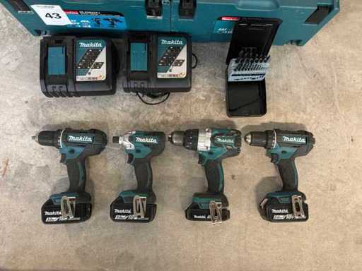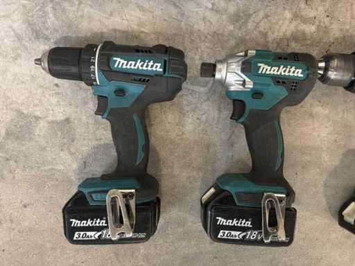 Składa się z: 3x wiertarki bezprzewodowej Makita, 1x bateriowej śrubokręta udarowej Makita. Zawiera 2 etui i 2 ładowarki do baterii.