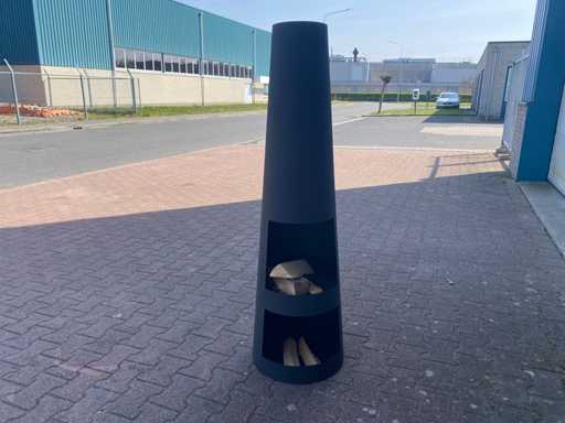 145 cm wysokości, pokryty na czarno. Nowoczesny i atrakcyjny kominek ogrodowy. Wysokiej jakości i wytrzymały materiał arkuszowy wykonany ze stali o grubości 1,6 mm i w pełni spawana konstrukcja. nieużywany w pudełku., z wyłączeniem drewna, Pudełko może mieć pewne uszkodzenia transportowe