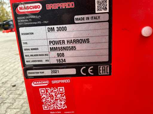 Maschio power harrow od 2021 roku, wyposażony w 12 głowic wirników, połączenie trzypunktowe, wysokowysokościową nożkę poziomującą, wał PTO, strukturę do wysiewania Kockerling, 66 wylotów, packer do kruszków, pierścień ø 600 mm, rolki klatkowe, toczenie nasion, regulację dawkowania, licznik amaloge hectare, napęd wirnika,