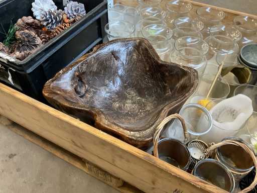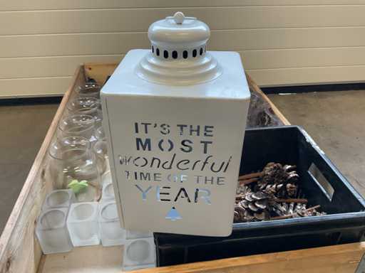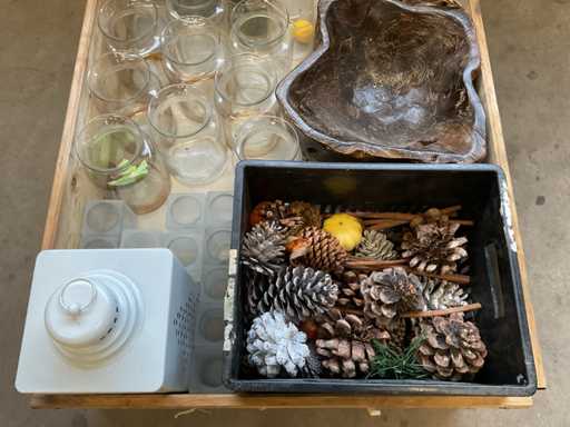 w tym lampy wiatrowe, świeczniki na tealighty, drewniane miski, wazony, szyszki itp.