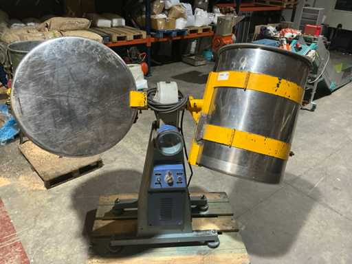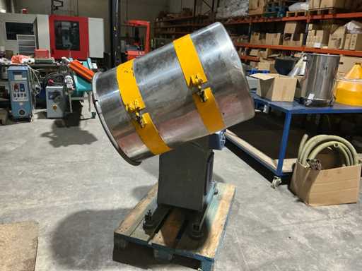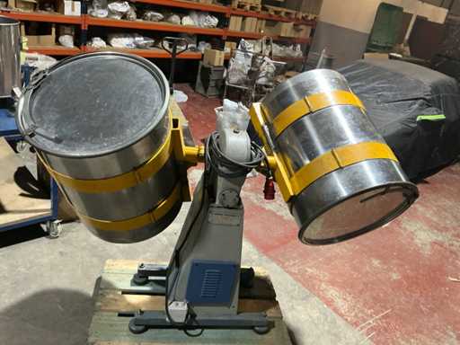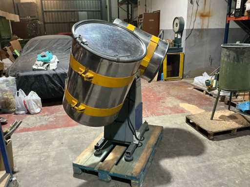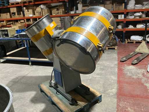Mieszarka beczkowa ze stali nierdzewnej typu tilting do mieszania i homogenizacji materiałów masowych, takich jak granulki i proszki, w zastosowaniach przemysłowych.