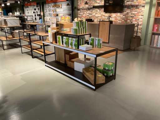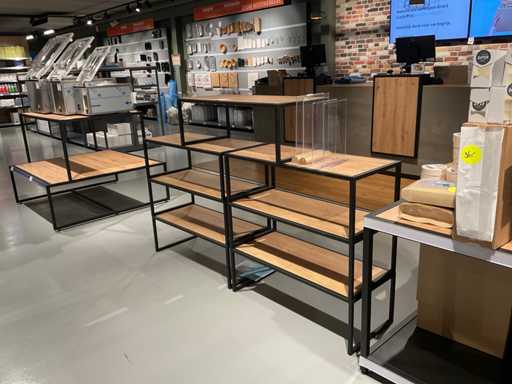 2x stół 200 x 75,5 x 76 cm i 5x mały stolik 90 x 40 x 30 cm, bez zawartości.