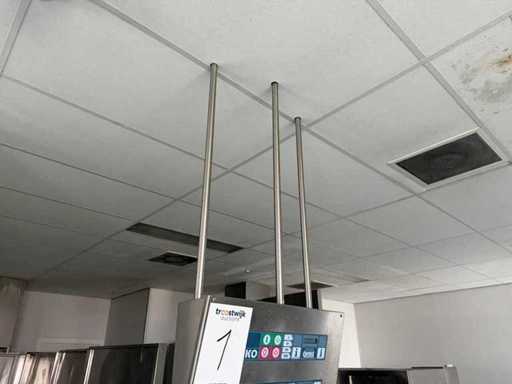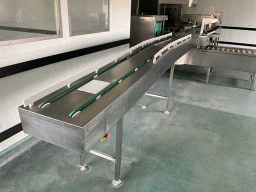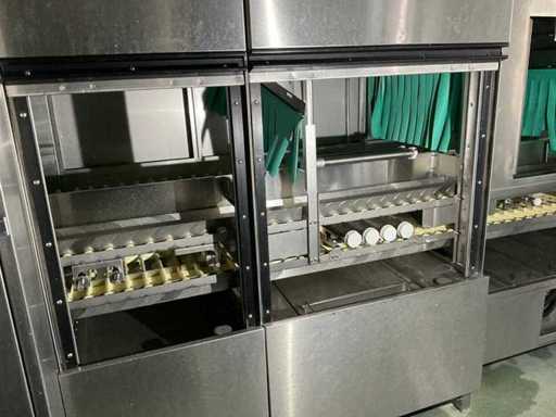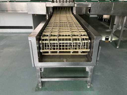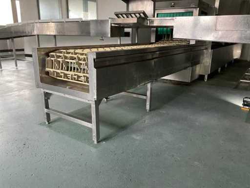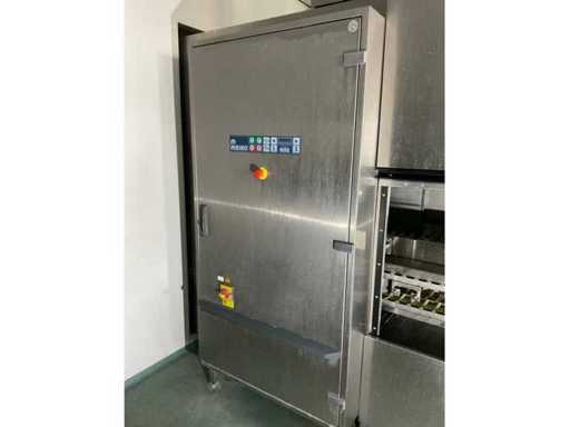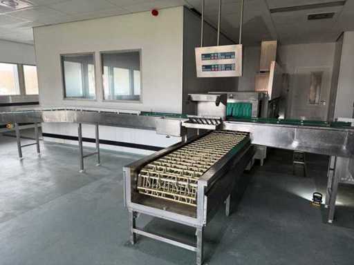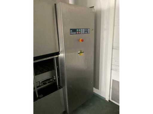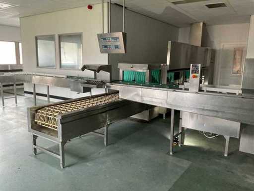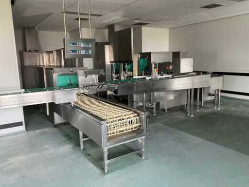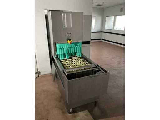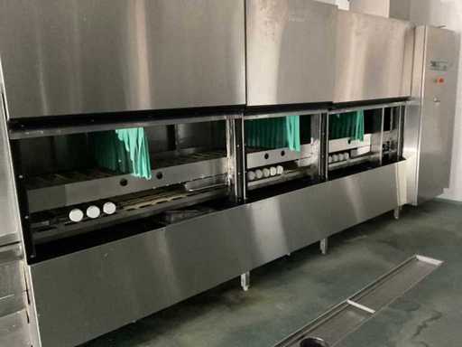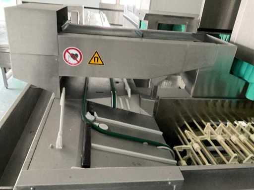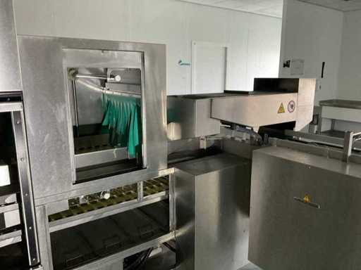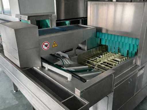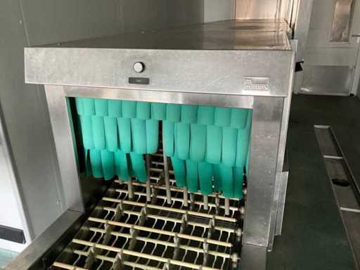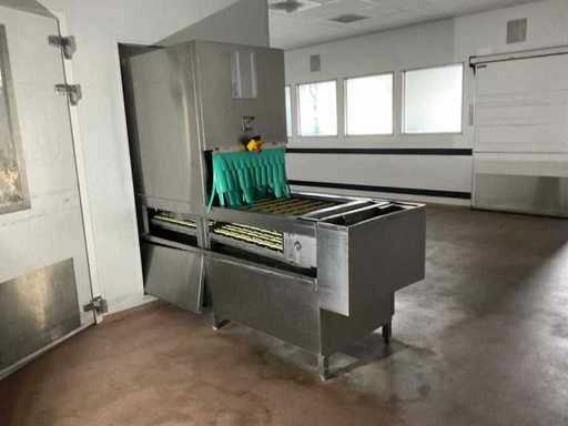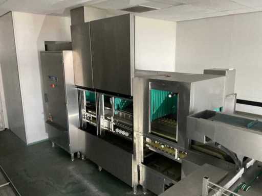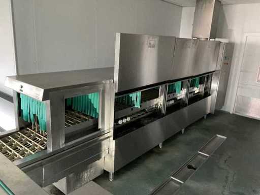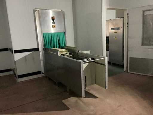 System składa się z kilku funkcjonalnych stref: strefa wejściowa z systemem przedpłukania CSS-Top, strefa wstępnego mycia, pierwsza główna strefa mycia, druga główna strefa mycia, strefa CSS-Plus, strefa płukania, strefa wypuszczania/suszenia, strefa wyjściowa; Wyposażona w: Wyposażony w system diagnostyczny Meiko Clean-Control do monitorowania procesów, kontroli temperatury, powiadamiania o awariach i rejestracji czasu pracy; System zapewnia odzysk energii przez blok skraplacza, zintegrowany kocioł do płukania oraz strefę suszenia z wentylatorem. Prędkość transportu regulowana w 3 prędkościach (ok. 1,8 metra na minutę); Dane techniczne według dokumentacji: Całkowita długość instalacji ok. 9 100 mm, użyteczna szerokość taśmy ok. 620 mm, napełnienie zbiornika ok. 410 litrów (60°C), zużycie wody do płukania ok. 380 litrów na godzinę, dostawa wody DN 20 (2,5 – 5 bar), drenaż DN 100, moc ekstrakcyjna konstrukcyjna ok. 1 500 m³ na godzinę, całkowite obciążenie podłączone ok. 65 kW (125 amperów), wersja całkowicie ze stali nierdzewnej 304; Instalacja jest w stanie użytkowym, z normalnymi śladami zużycia odpowiednimi do użytku profesjonalnego. Instalacja nie była testowana podczas pracy; lot musi zostać całkowicie rozłożony; demontaż i transport całkowicie kosztem i ryzykiem kupującego;