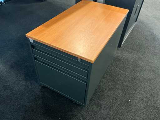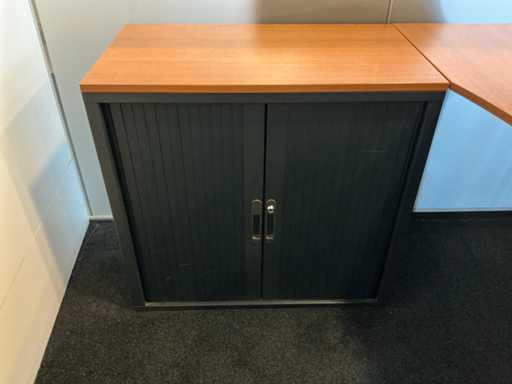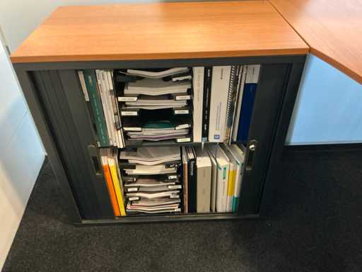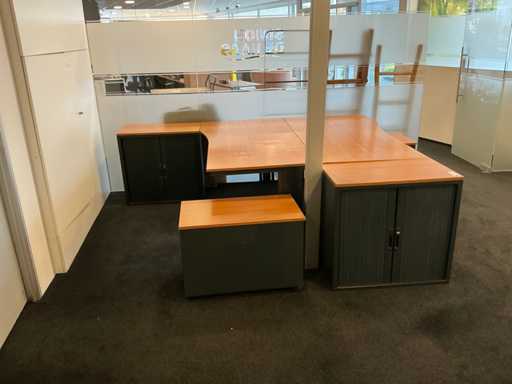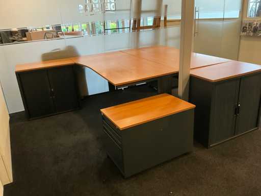 Składa się z 2 narożnych biurek, 2 szafek z szufladami oraz 2 szafek z przesuwnymi drzwiami i zawartością.