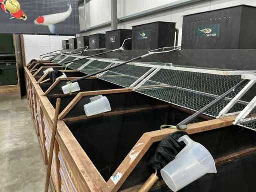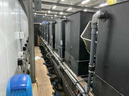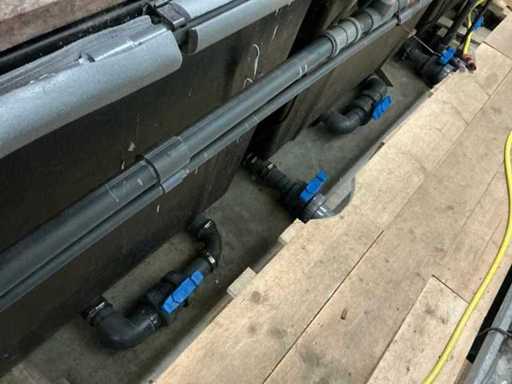 Wymiary: 920x250x200cm. Podzielone na 8 zbiorników wodnych (106x124x90cm) wyposażonych w instalację filtrów Aqua Forte DM-Vario 10000S/pompy tlenowe. Ta partia musi zostać dostarczona całkowicie czysta. Wyposażony w różne akcesoria.