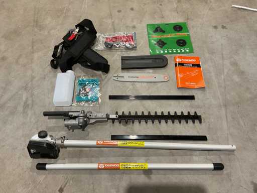 Wyposażony w nylonową linkę; nożyce do żywopłotu; piła łańcuchowa; ostrze do przycinania; Nieużywany w pudełku (wymiary opakowania transportowego 325x1095x305 mm dł. x szer. x wys., waga 15 kg)