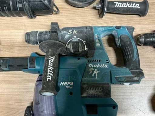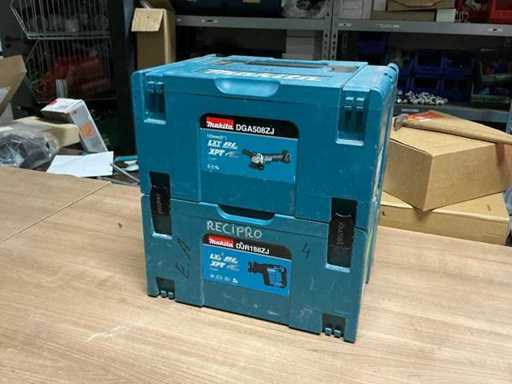 Składa się z: wiertarki młotkowej DHR243 z filtrem HEPA, szlifierki kątowej DGA504, wiertarki DDF484, 2 baterii oraz ładowarki do baterii w 2 obudowkach.