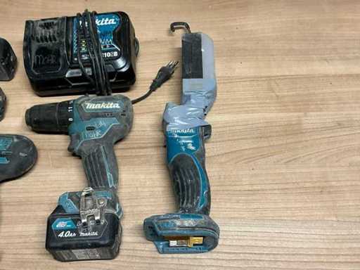 Składa się z: śrubokręta udarowego TD110D, uszkodzonej lampy DML801, wiertarki DF332D, 3 baterii oraz ładowarki do baterii w obudowie.