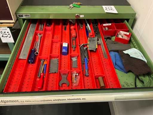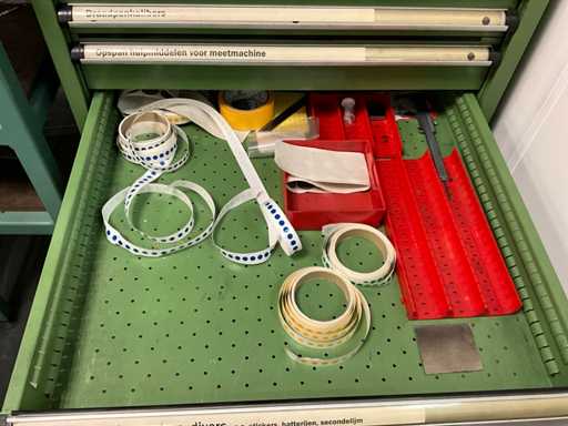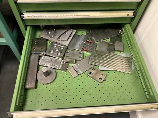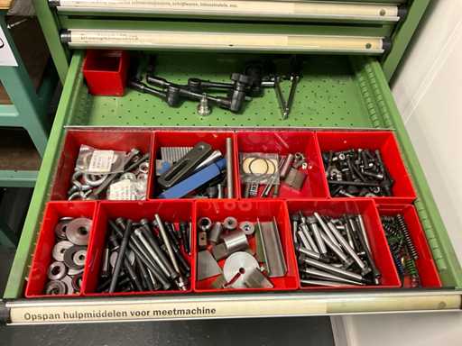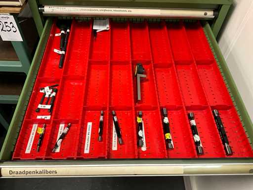 składa się z kalibrów gwintowanych sworzni, pomocy zaciskowych, włącznie z komodą z 8 szufladami, z kluczem,