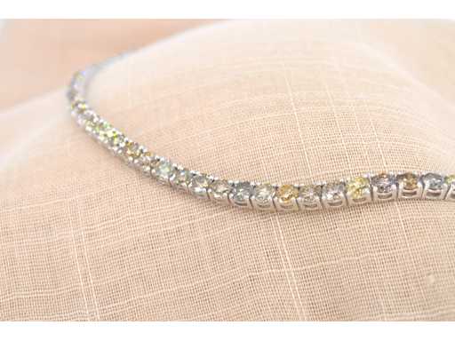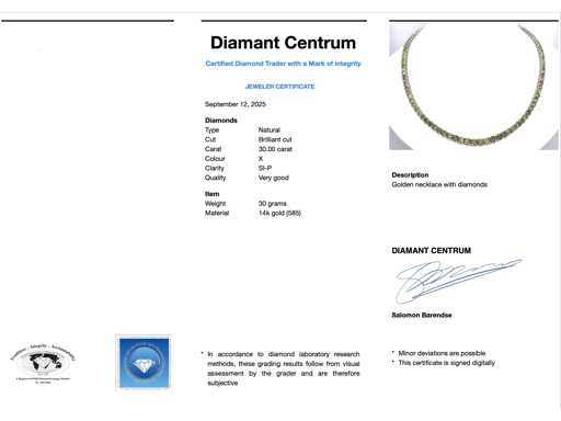 Diament: naturalny; Ilość: 105 sztuk; Cięcie: Brilliant cut; Waga (karat): 30,00 karat; Kolor: X; Czystość: SI-P; Cięcie: Piękne; Klejnot: Naszyjnik; Waga: 30 gramów; Wymiary/długość: 43 cm; Materiał: 14 karatów (585); Stan zdrowia: Nowy; Pakowanie: Luksusowa szkatułka na biżuterię; Wyjaśnienie: Jakość została zaczerpnięta z raportu dotyczącego przedmiotu. Wycena to ocena certyfikowanego dealera diamentów, oparta na cenach konsumpcjalnych; Cena konsumencka: € 71 300
