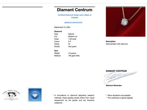 Diament: naturalny; Ilość: 1 sztuka; Cięcie: Brilliant cut; Waga (karat): 1,00 karat; Kolor: E-F; Czystość: SI; Jakość cięcia: bardzo ładna; Klejnot: Wisiorek (z wyjątkiem naszyjnika); Waga: 3,5 uncji; Wymiary/długość: 42 cm; Materiał: 18K gold (750); Stan zdrowia: Nowy; Pakowanie: Luksusowa szkatułka na biżuterię; Wyjaśnienie: Jakość została zaczerpnięta z raportu dotyczącego przedmiotu. Wycena to ocena certyfikowanego dealera diamentów, oparta na cenach konsumpcjalnych; Cena konsumencka: € 12 000