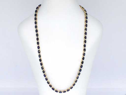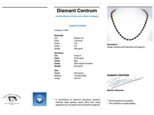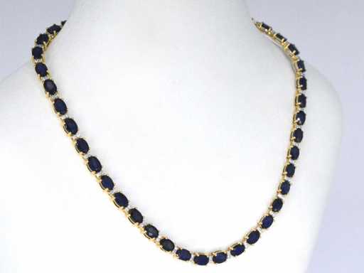 Diament: naturalny; Ilość: 124 sztuki; Cięcie: Brilliant cut; Waga (karat): 1,50 karat; Kolor: F-G; Czystość: SI-P; Jakość cięcia: Bardzo ładna; Kamień szlachetny: szafir; Cięcie: Kształt łzy; Waga (karat): 35,00 karat; Kolor: niebieski; Czystość: z naturalnymi inkluzjami; Cięcie: Bardzo dobrze; Klejnot: Naszyjnik; Waga: 26 gramów; Wymiary/długość: 46 cm; Materiał: 14 karatów (585); Stan zdrowia: Nowy; Pakowanie: Luksusowa szkatułka na biżuterię; Wyjaśnienie: Jakość została zaczerpnięta z raportu dotyczącego przedmiotu. Wycena to ocena certyfikowanego dealera diamentów, oparta na cenach konsumpcjalnych; Cena konsumencka: € 20 510