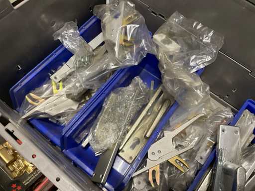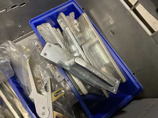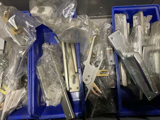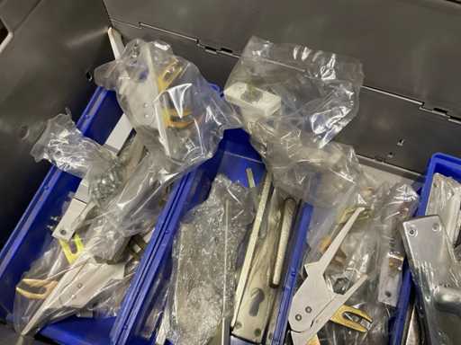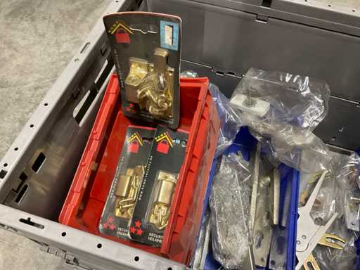 Różne okucia drzwiowe i okienne w plastikowej skrzyni