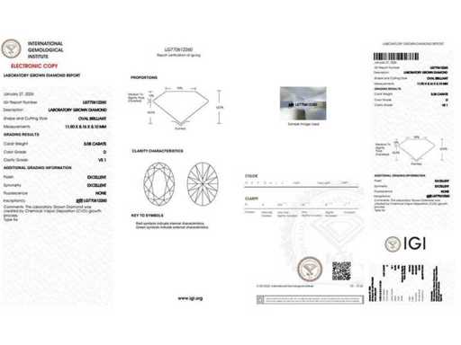 Ten laboratoryjnie wyhodowany diament posiada oficjalny certyfikat IGI oraz raport potwierdzający jego jakość. Zobacz certyfikat na zdjęciach lub zapoznaj się z tabelą powyżej, aby uzyskać szczegółowe specyfikacje. Wszystkie cechy zostały zaczerpnięte bezpośrednio z towarzyszącego raportu IGI.