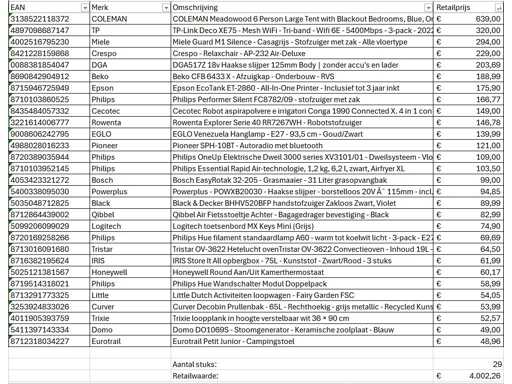 Dotyczy to partii zwróconych towarów marki A od dużego sprzedawcy internetowego. Partia składa się z różnych kategorii produktów. Ilość sztuk: 29. Wartość detaliczna: €4002,- Niezaznaczone: operacja nieznana (mix