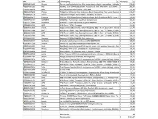 Dotyczy to partii zwróconych towarów marki A od dużego sprzedawcy internetowego. Partia składa się z różnych kategorii produktów. Ilość sztuk: 41. Wartość detaliczna: €4551,- Niezaznaczone: operacja nieznana (mix