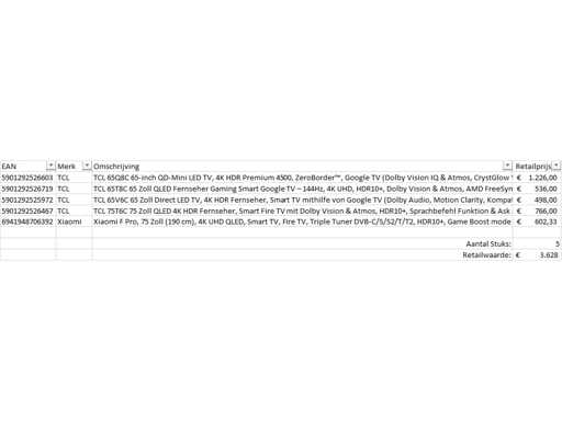 Dotyczy to partii odbioru telewizorów z dużego sklepu internetowego. Impreza składa się z telewizorów o różnych rozmiarach. Liczba egzemplarzy: 5. Wartość detaliczna: €3628,- Telewizory nie działają i można je wykorzystać na części. Przyjdź w dniu oglądania, aby dobrze poznać powód powrotu. Zobacz zdjęcia, aby poznać listę treści.