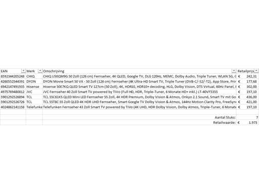 Dotyczy to partii odbioru telewizorów z dużego sklepu internetowego. Impreza składa się z telewizorów o różnych rozmiarach. Liczba egzemplarzy: 7. Wartość detaliczna: €1973, - Telewizory nie działają i mogą być używane na części. Przyjdź w dniu oglądania, aby dobrze poznać powód powrotu. Zobacz zdjęcia, aby poznać listę treści.