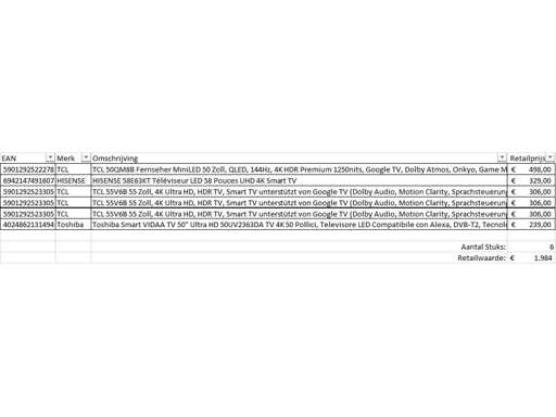 Dotyczy to partii odbioru telewizorów z dużego sklepu internetowego. Impreza składa się z telewizorów o różnych rozmiarach. Liczba pionków: . Wartość detaliczna: Telewizory nie działają i można je wykorzystać do części zaczepienia. Przyjdź w dniu oglądania, aby dobrze poznać powód powrotu. Zobacz zdjęcia, aby poznać listę treści.