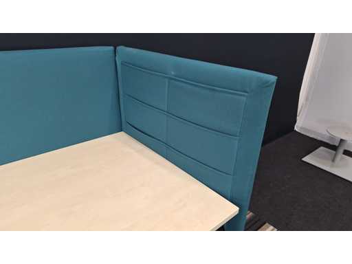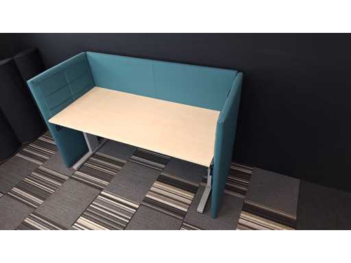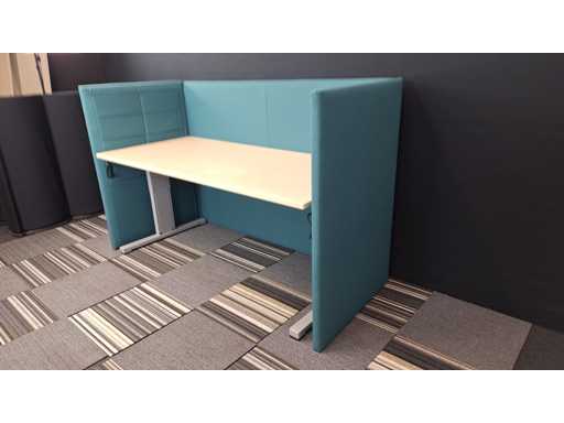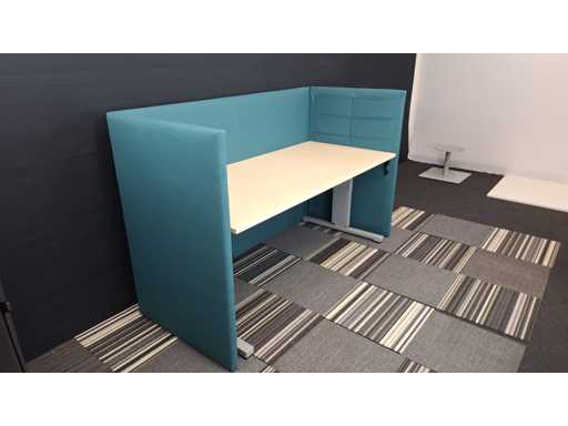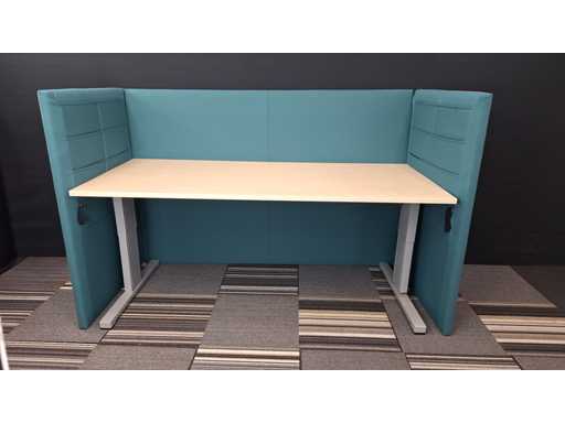 biurko Pami, podstawa z regulacją wysokości (620 - 820 mm) w kolorze metalowym Alu, góra w kolorze melaminowym Maple, ekran akustyczny pokryty tkaniną w kolorze Turkus, w bardzo dobrym stanie