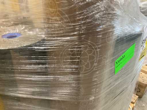 2 palety z m.in. papierem pakowym w różnych rozmiarach i kolorach, folią w różnej jakości i formatach, wstążkami oraz różnymi szerokościami i kolorami, pistoletami do klejenia itp., w tym paletami.