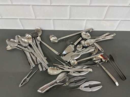 Partia łyżek do serwowania ze stali nierdzewnej oraz różne przybory kuchenne