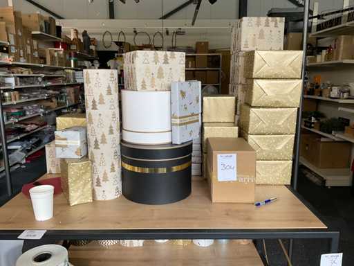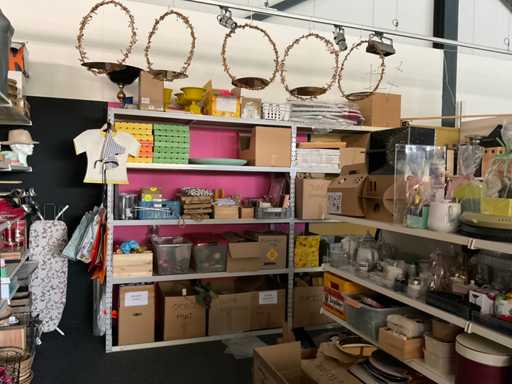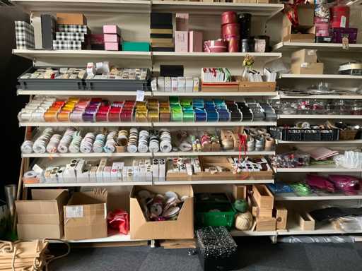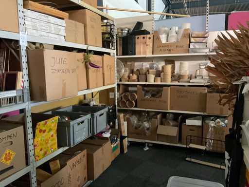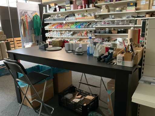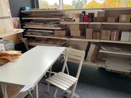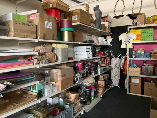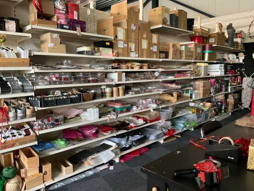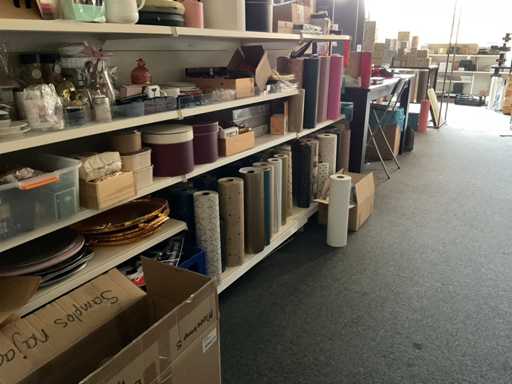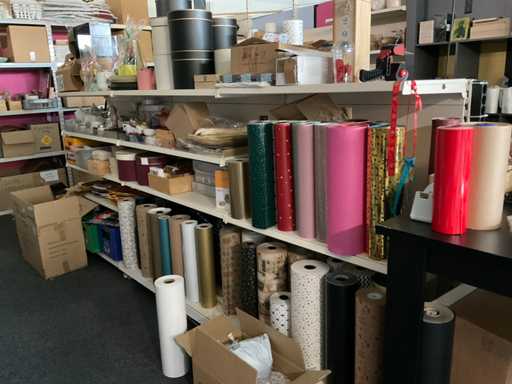Zawartość przestrzeni attelier składająca się z zwijających się wstążek, opakowań na wino, etykiet, toreb, pudełek okiennych, różnych pudełek na prezenty, materiałów dekoracyjnych, papieru do pakowania, koszy, wiader i pudełek, materiału okiennego, materiałów jednorazowych, pudełek na ciasta, kubków, systemu odwijania legro, w tym stołu do pakowania i 2 stołków 200 x 124 x 100 cm bez stojaka. Parking znajduje się na 1. piętrze i nie ma windy.