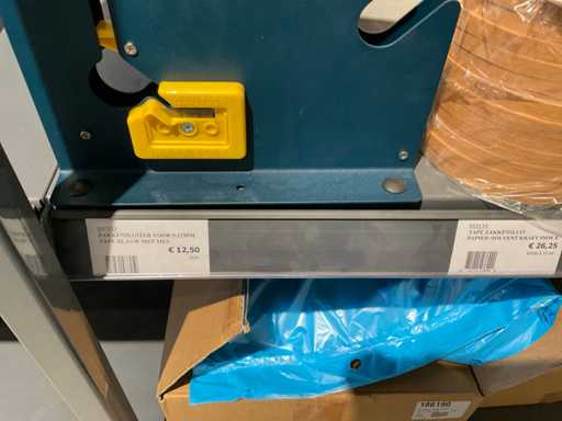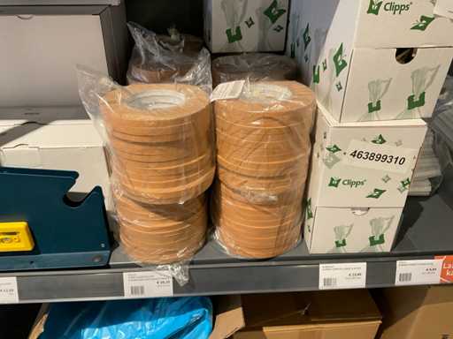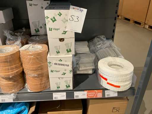 Zawartość 1 strony stojaka składająca się z uchwytu rolki taśmy, taśmy, spinaczy do papieru, zapięć na klipsy, torb, bez stojaka.